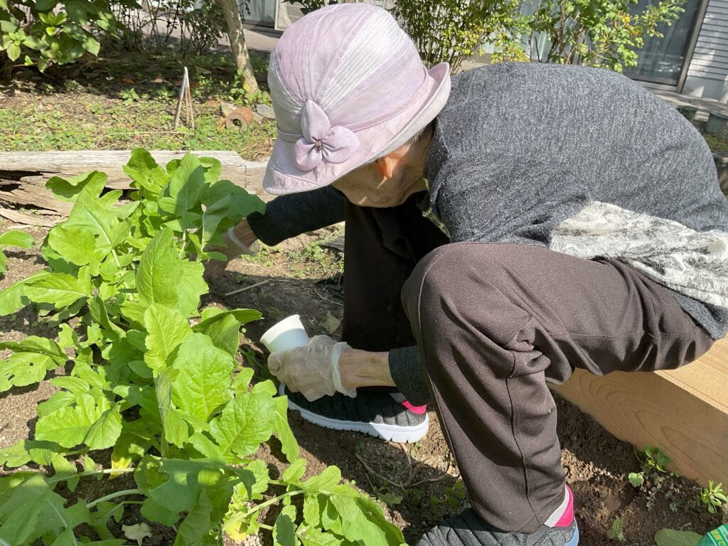 「せやせや、あれもせな」と肥料やりと大根の葉を間引きしました。