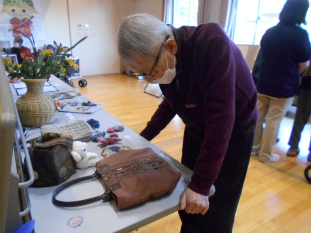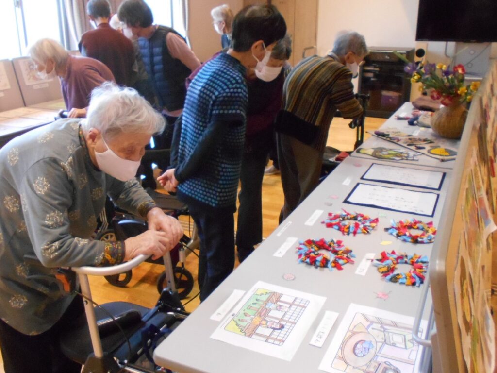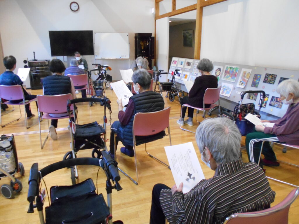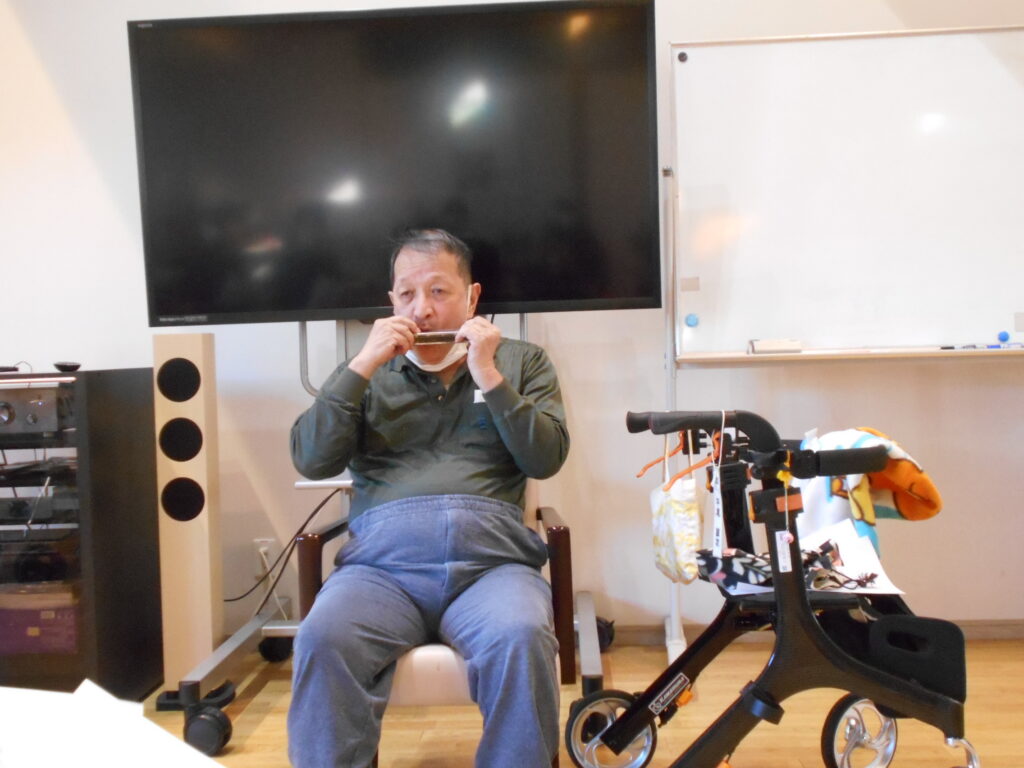 作品展示だけでなく、音楽会もしました。ハーモニカ演奏が趣味の入居者さんの演奏に合わせてみんなで歌を歌いました。