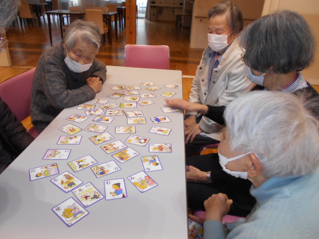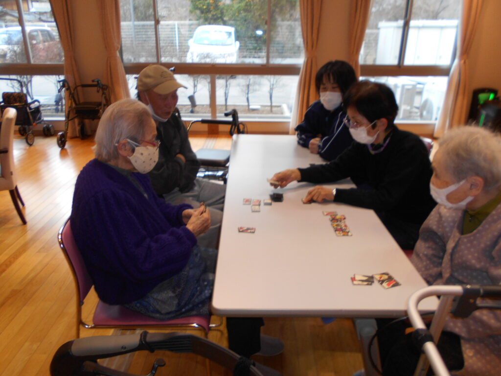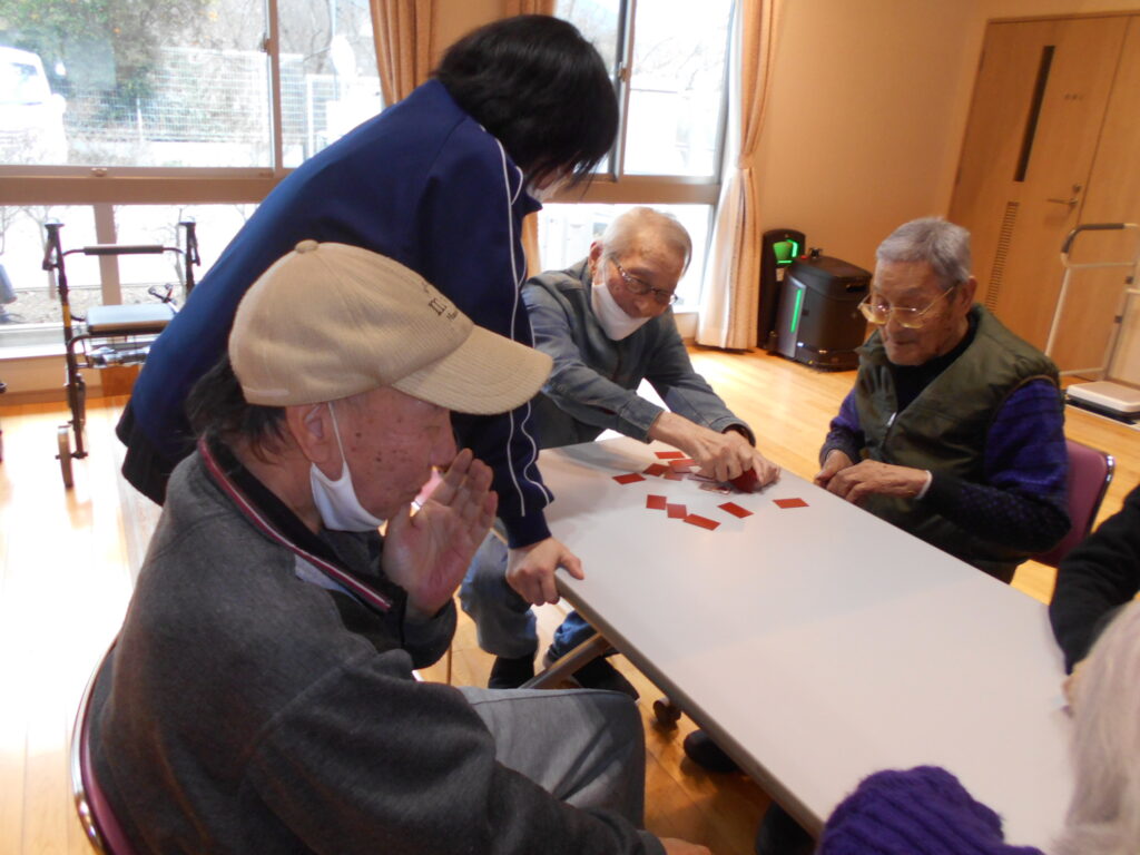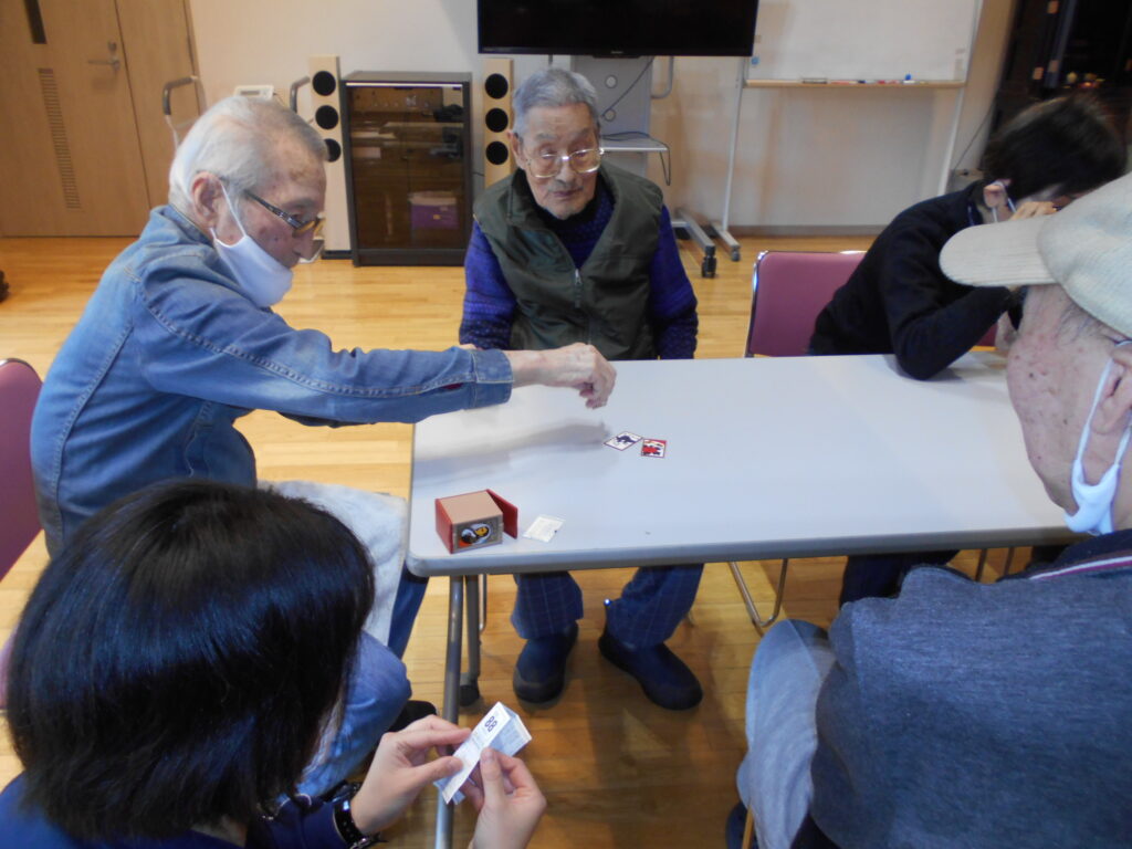 2026.02.15 りしょう カードゲーム 日曜日の午後、ホールでカードゲームをしました。 三人で始めた花札。 男性も参加され、職員に手ほどき。 全くルールを知らない職員に丁寧に教えて下さいました。 トランプやカルタを楽しまれた方も。 あちこちから笑い声が聞こえる時間でした。